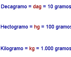 Son el kilogramo (kg), el hectogramo (hg) y el decagramo (dag).
